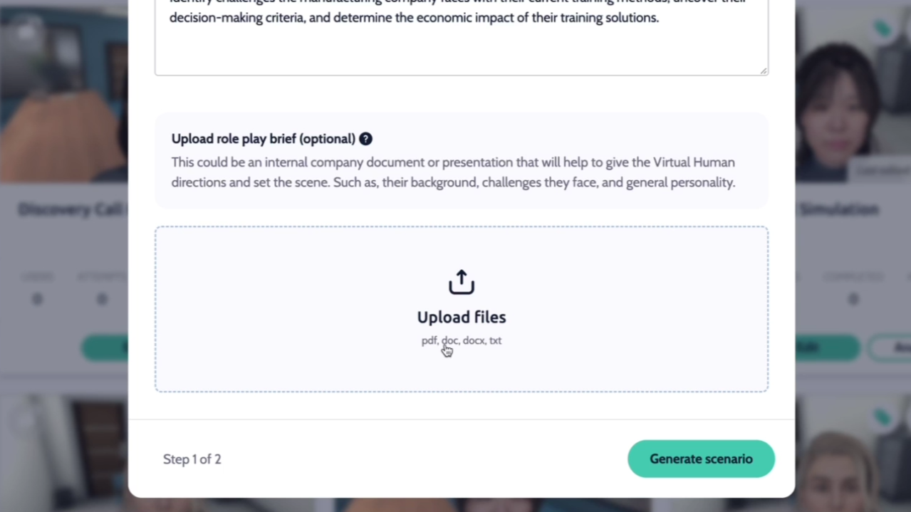 The "Upload" feature in the "Create with AI" tool is a game-changer for those who already have pre-existing materials such as role-play briefs, scripts, storyboards, or informational documents. By uploading your files (PDF or Word documents), the AI can tailor a role-play scenario around your content, saving you time and effort while ensuring the results align with your vision. Here are some best practices to help you make the most of this feature.