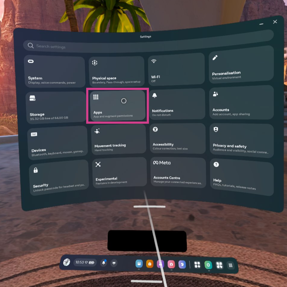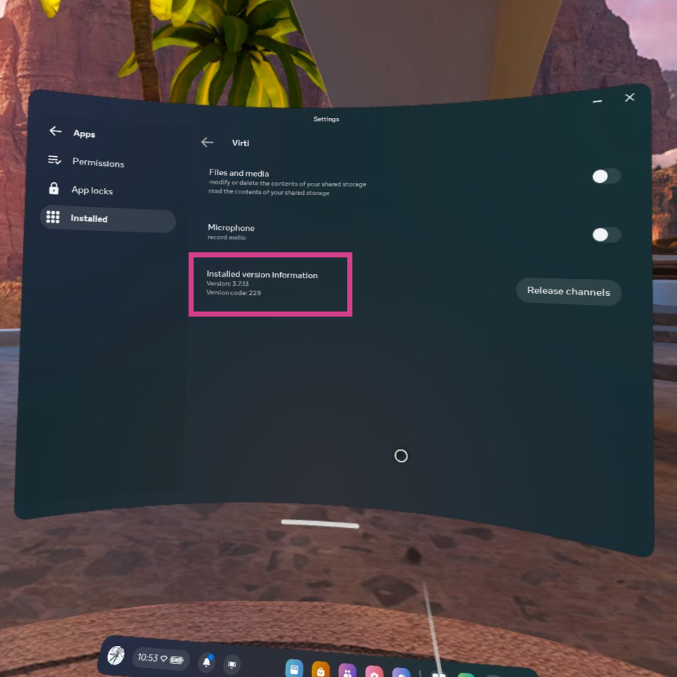Here you can see the application settings and the version you have installed onto your VR device: