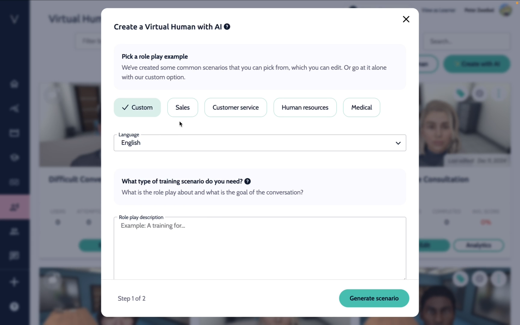 Select custom, and use the text field to describe your training audience or goals. If you have a specific idea, you can provide detailed information, and the AI will create it. Alternatively, if you're unsure, you can provide a generic topic, and the AI will take it from there. For best practices see: Best Practices for describing your training scenario with Create with AI