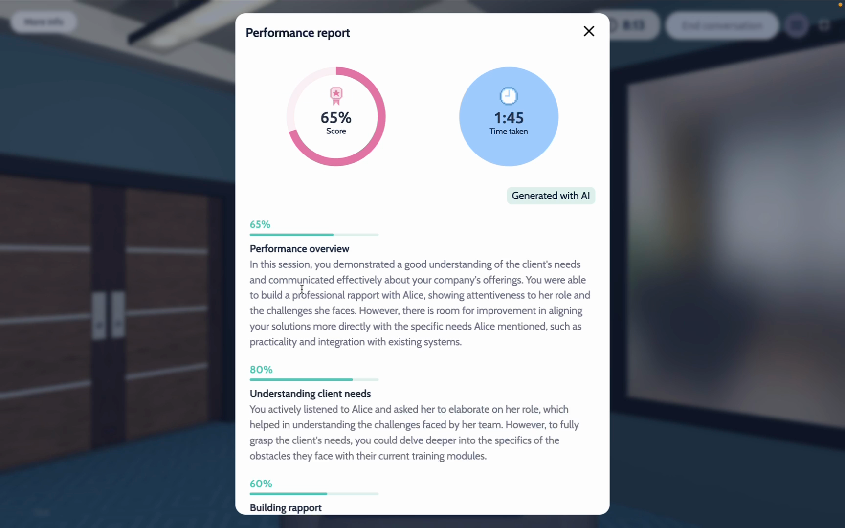 We can review how the system analyzed our performance against the evaluations. We get a score and detailed feedback on each one of our evaluation areas. This was a basic overview of creating a Virtual Human with AI.