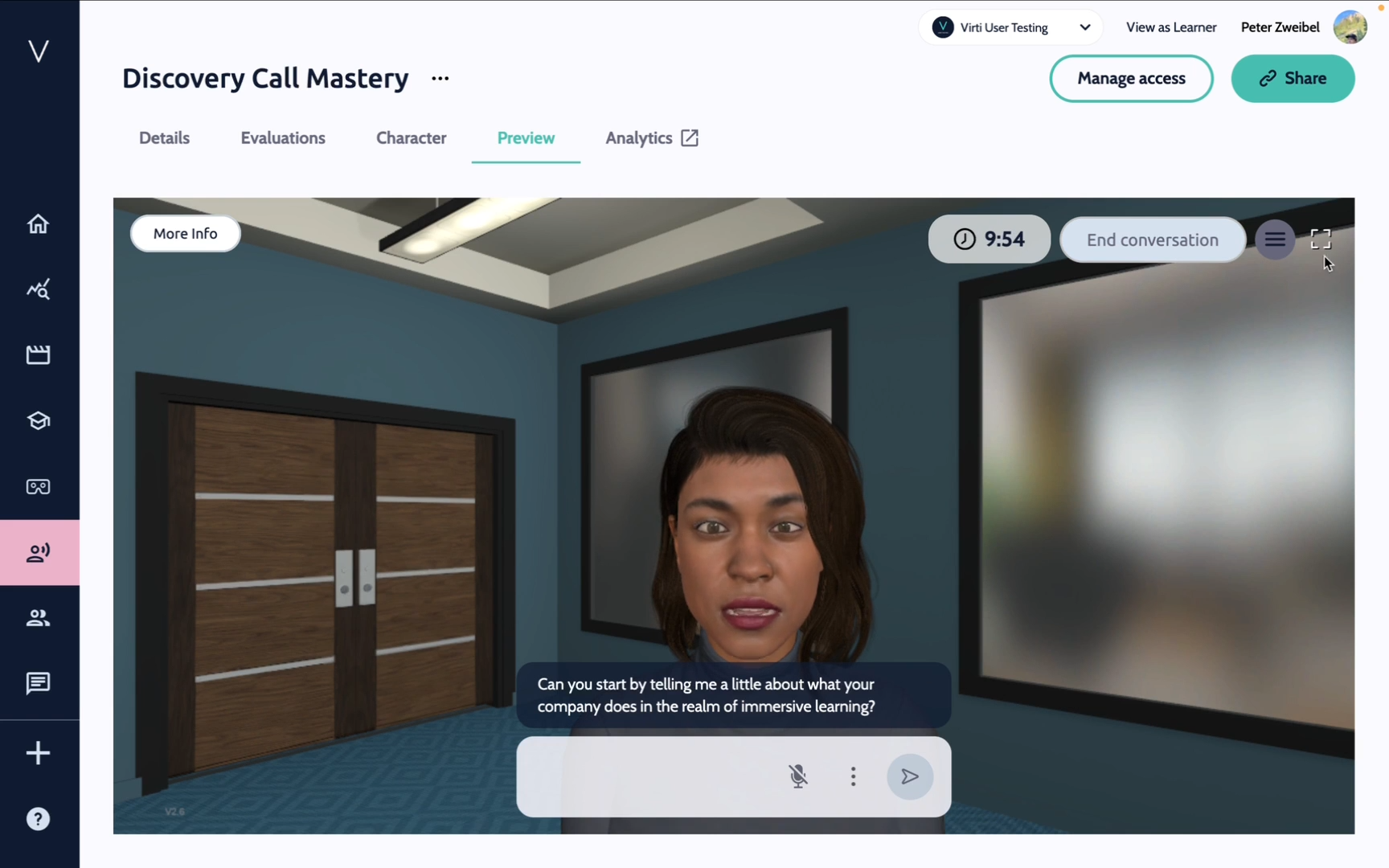 Here, you can interact with your Virtual Human and see how it responds. Pay attention to how they respond and if there is anything you would like to change. You can always go back and edit in the character page, to adapt the conversation to fit your goals. Once you are done, hit end conversation.