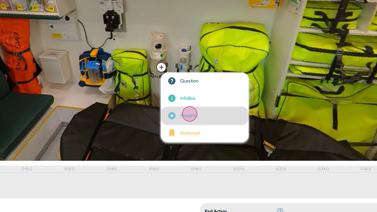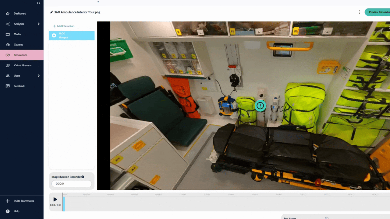 The interface of the editor is similar to the 360-degree video editor. The uploaded image will appear in 360-degree format. Click and drag around your video to look around. For more information on adding interactivity to simulations visit Creating Interactive Videos