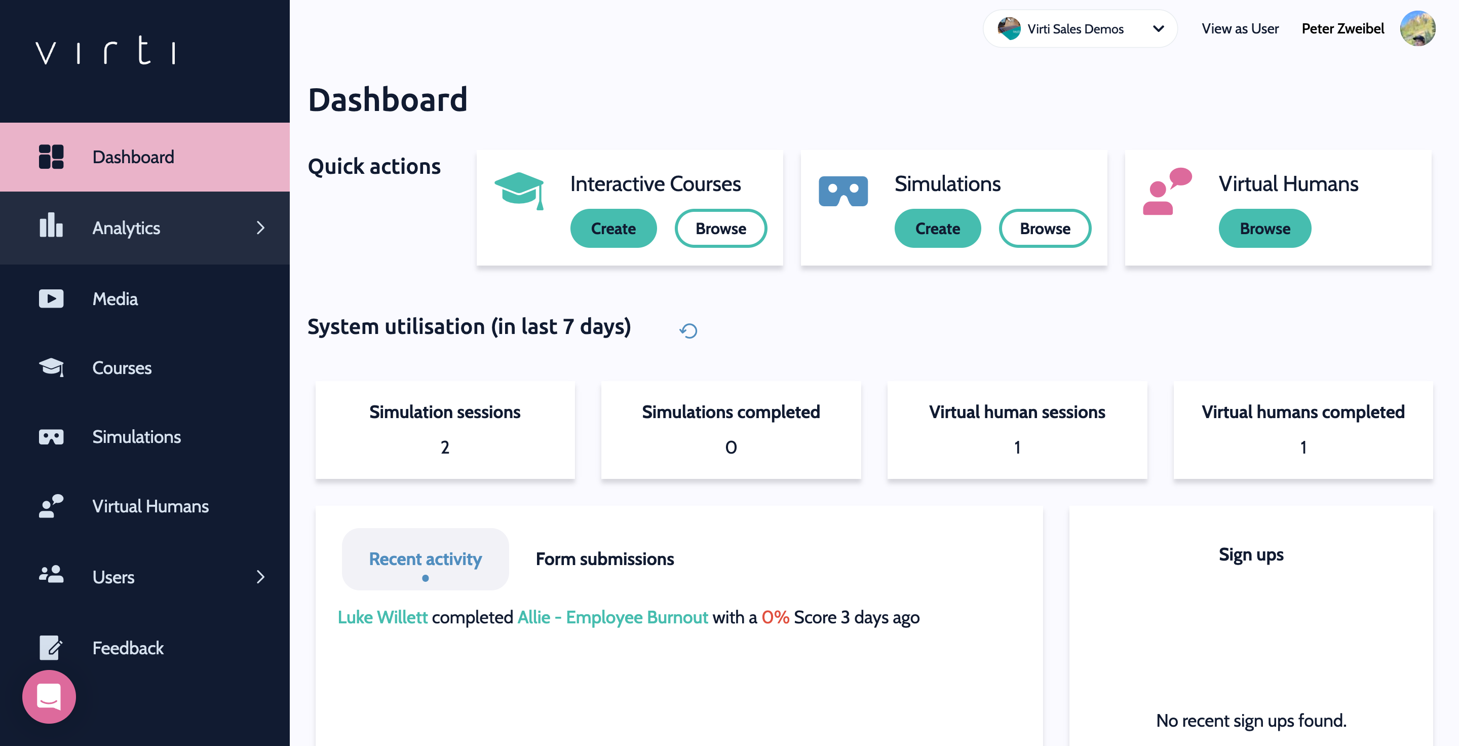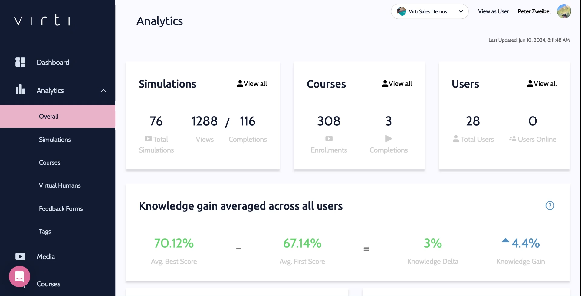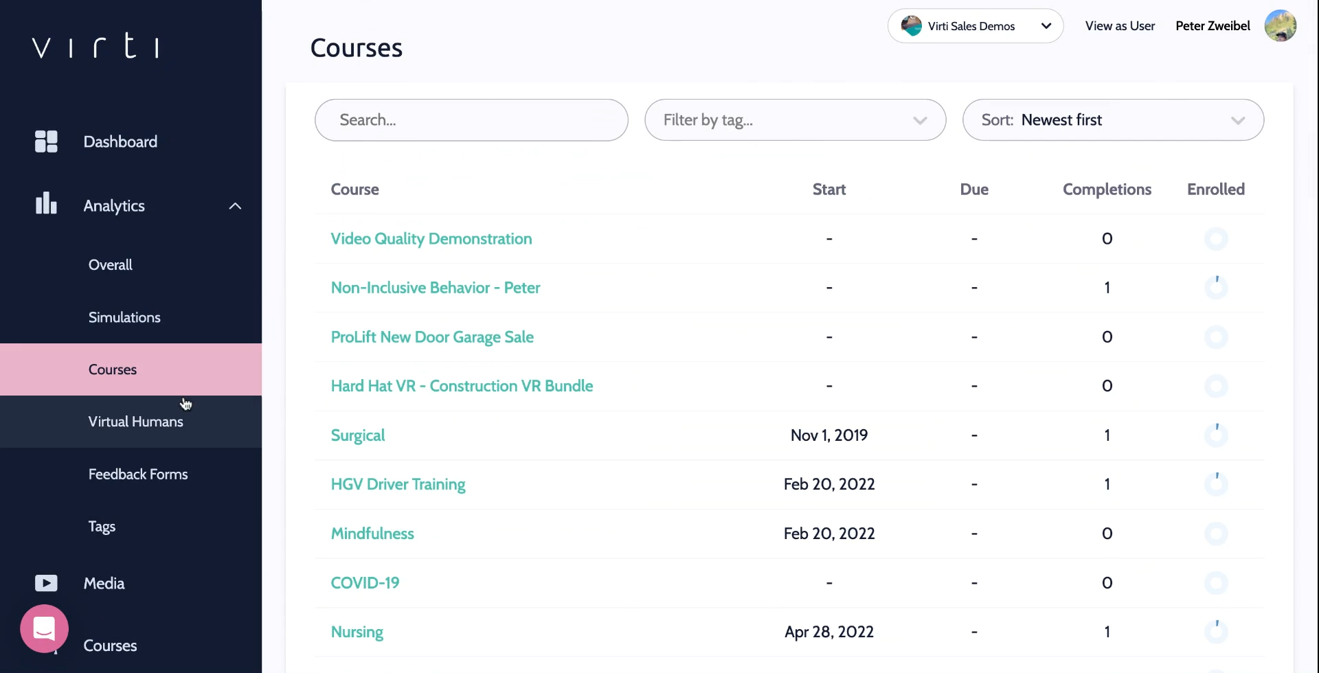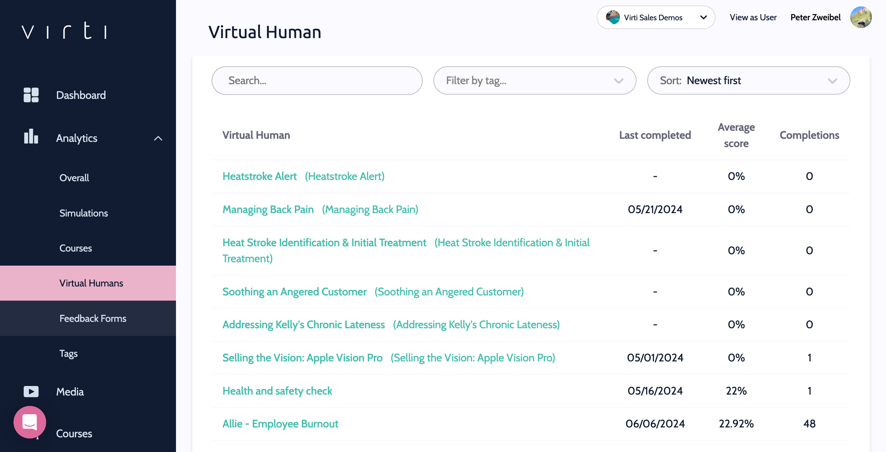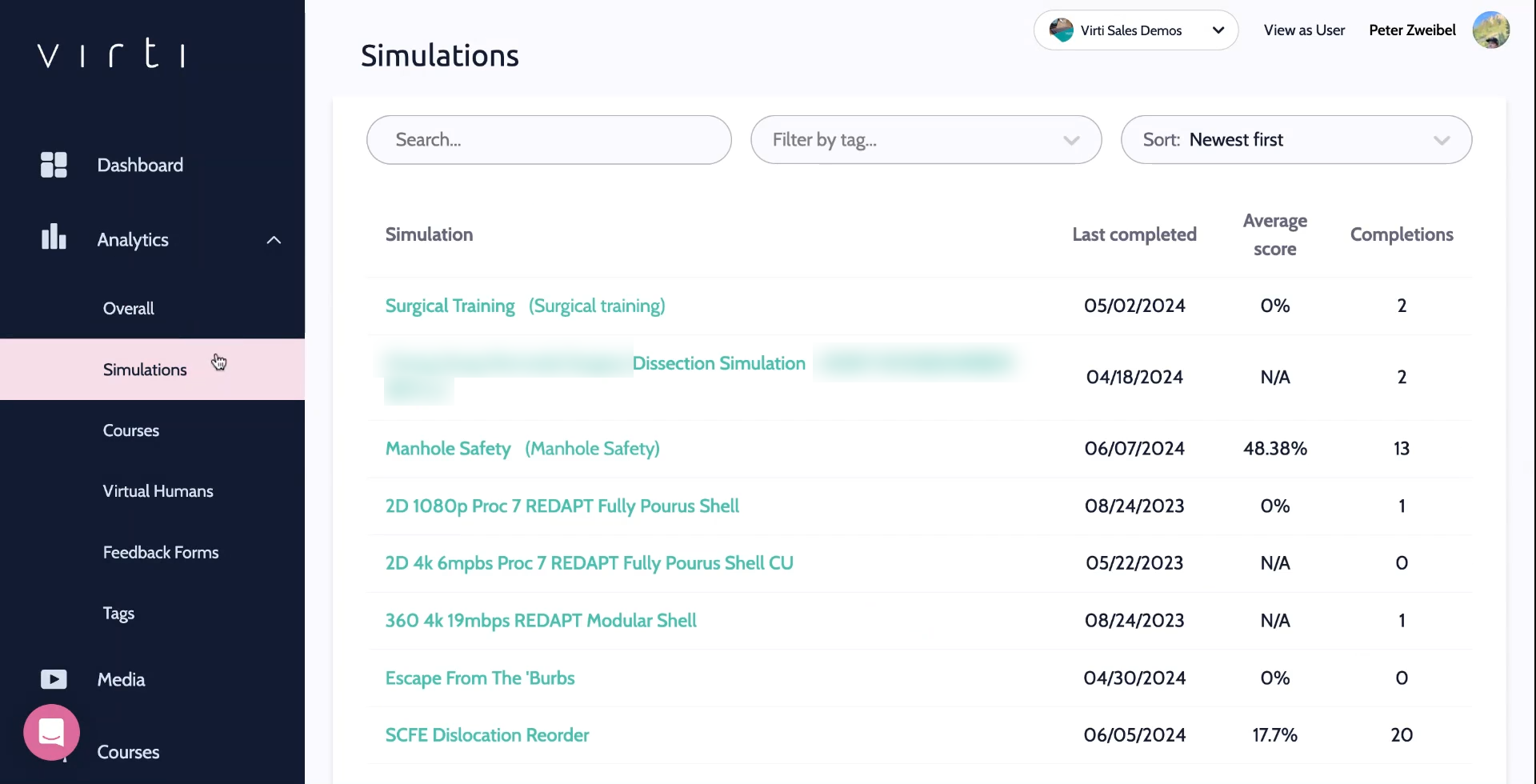Begin by selecting analytics, to view analytics for your overall organization, Simulations, Courses, Virtual Humans, Feedback Forms, and Tags.