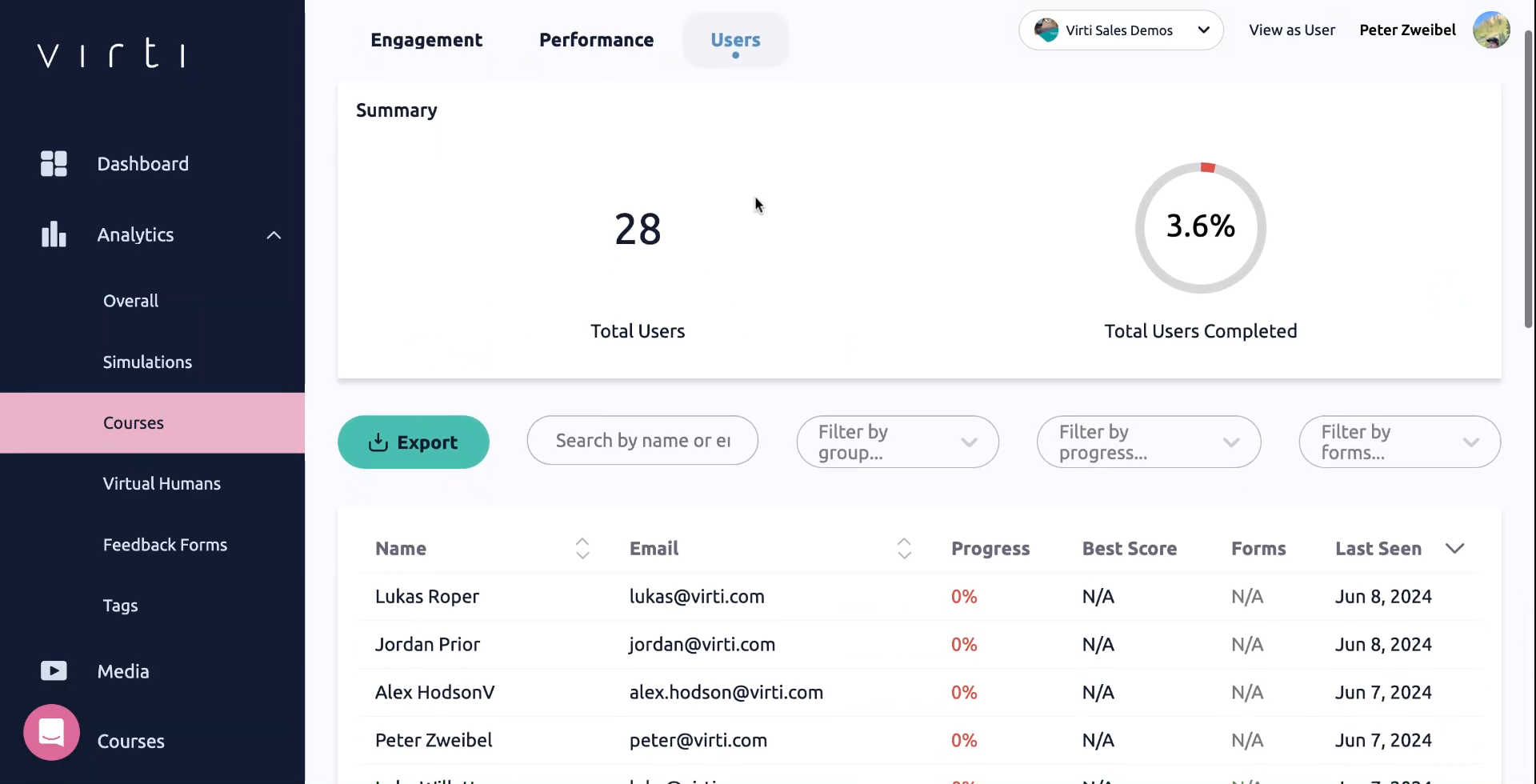 In the Users tab, you will get a breakdown of the progress of each individual learner, so you can identify who has completed the training, and who may need more time or support.