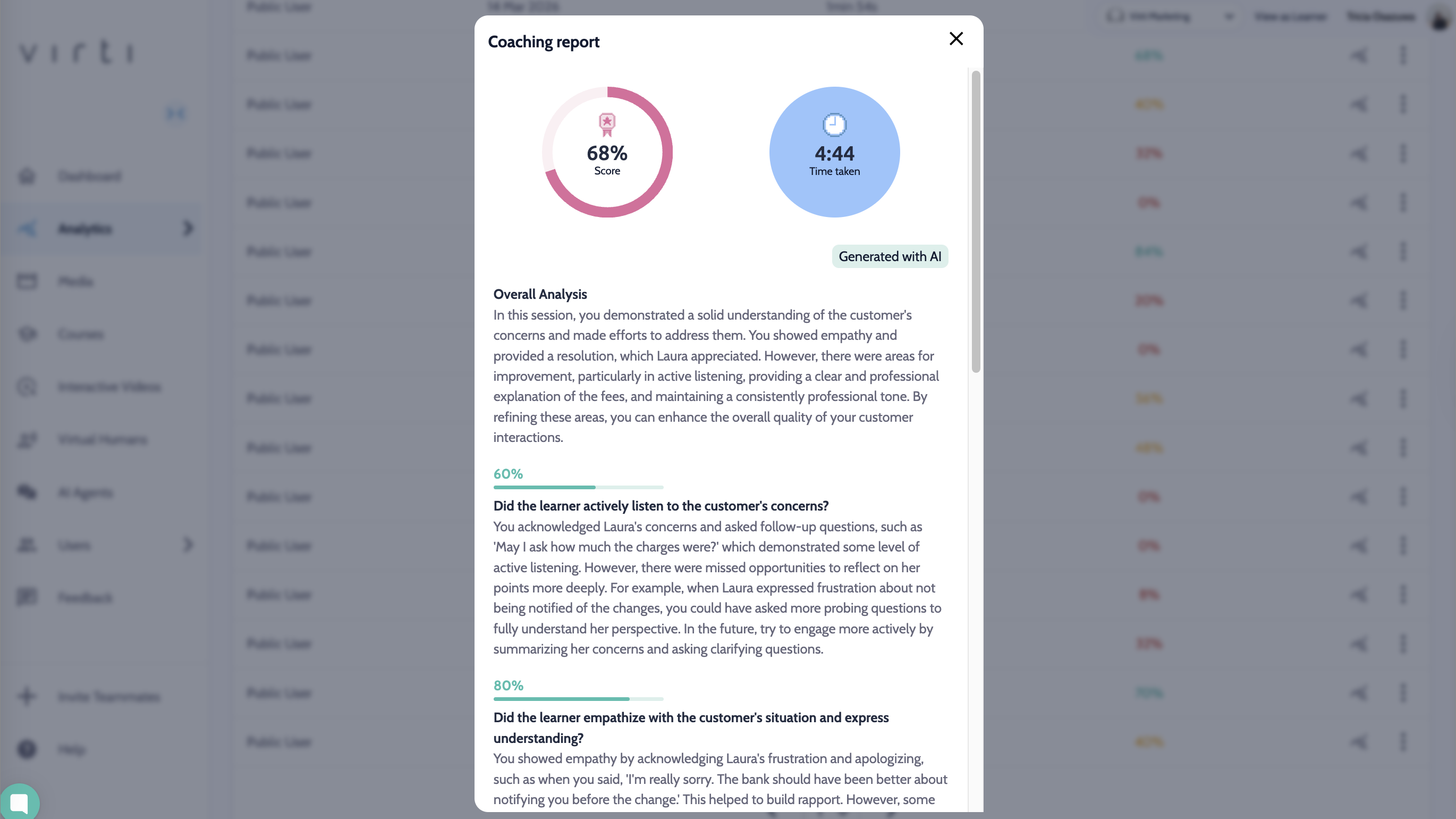 Performance Analysis uses generative AI to analyze the full conversation transcript, providing ratings and qualitative feedback based on conversation objectives. This offers a holistic view of learner performance and is especially effective for open-ended, soft-skills objectives like building rapport or demonstrating empathy.
