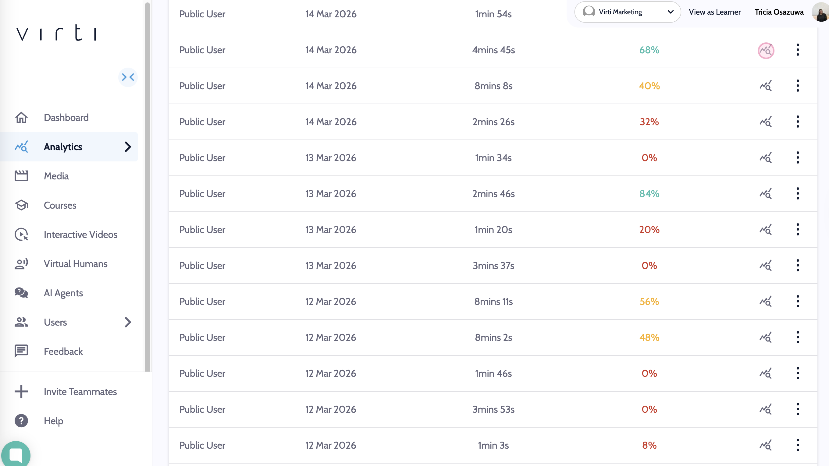 To access your learners Virtual Human performance reports, log in to app.virti.com, and navigate to a virtual human, and then to Analytics.