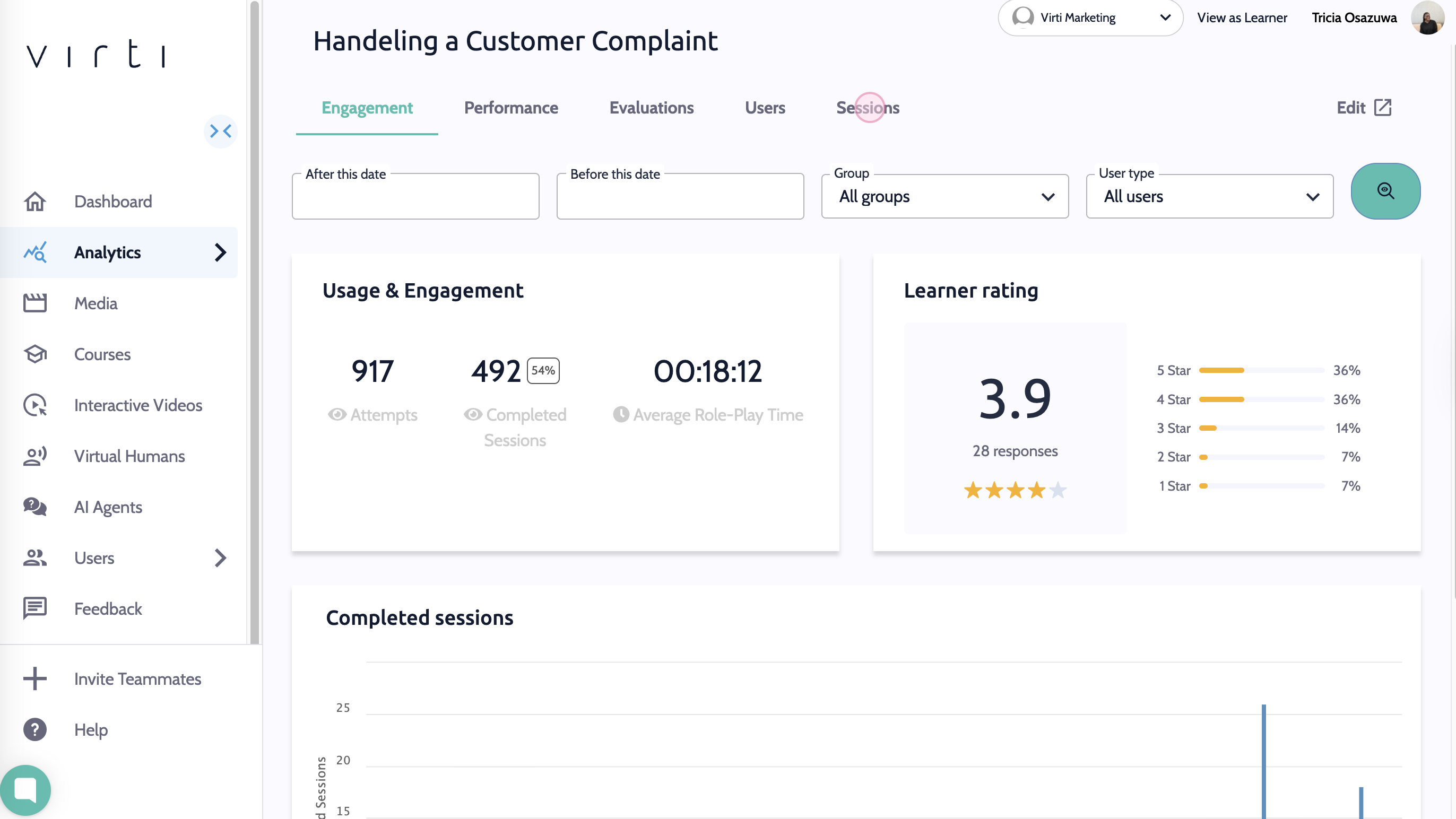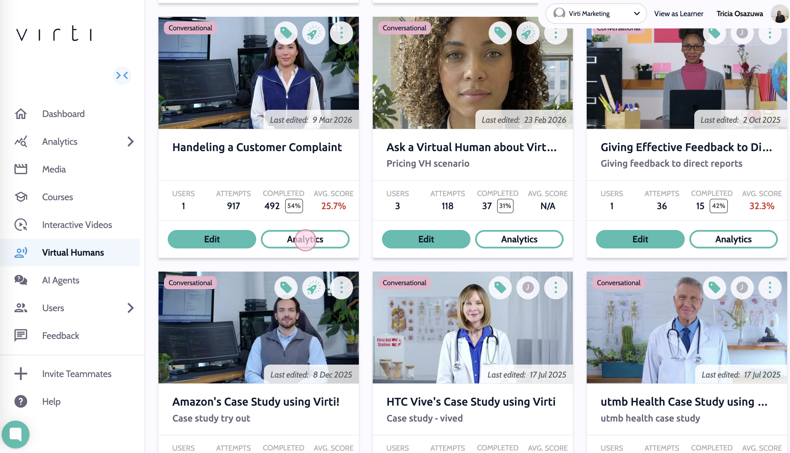 Virtual Humans provide a safe, standardized environment for learners to practice communication skills. This guide explains how to access and interpret performance reports, and the tyanalysis available to help you evaluate learner strengths and areas for improvement