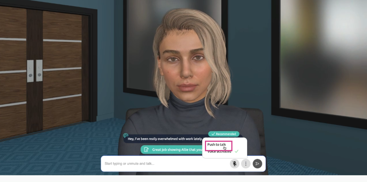 Voice activated mode is the default voice interaction, which detects when your voice and allows for natural flow of conversation. In this mode, the microphone stays active, and starts recording when you speak and sends the message to the Virtual Human when you stop.